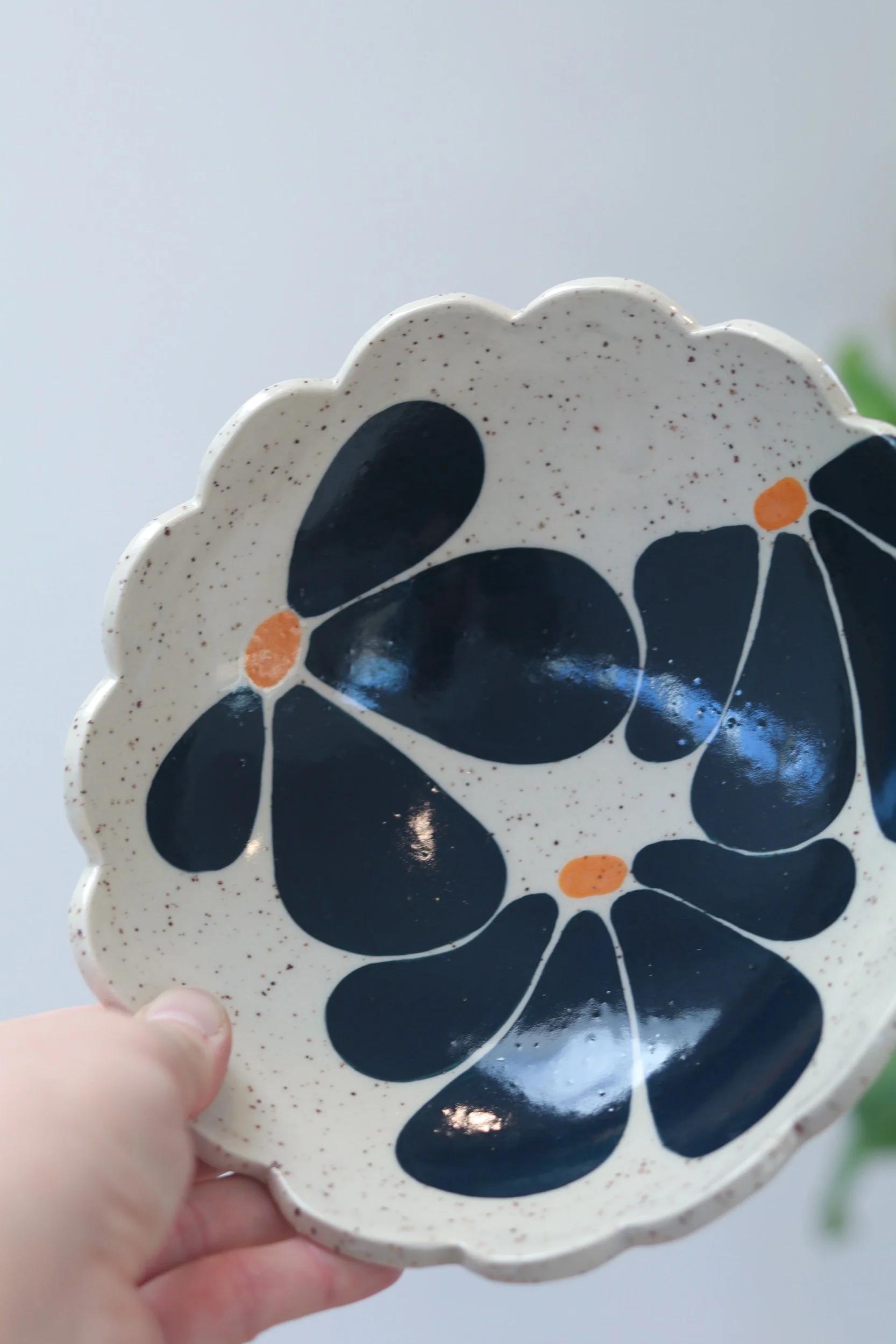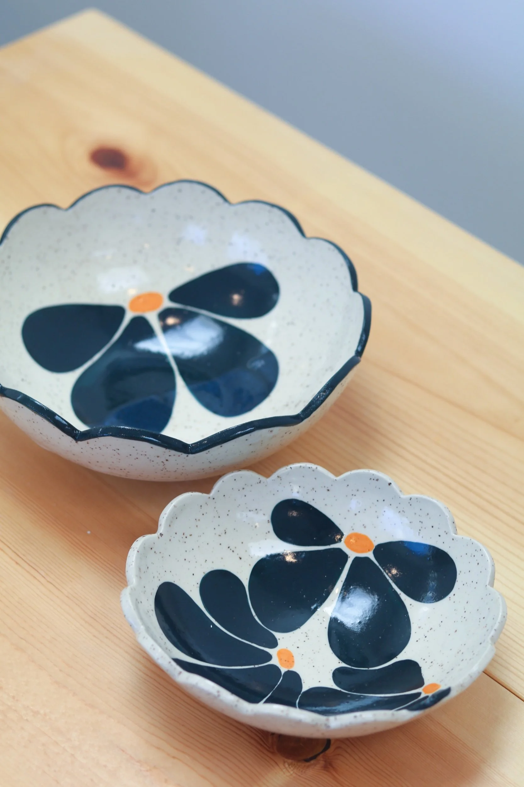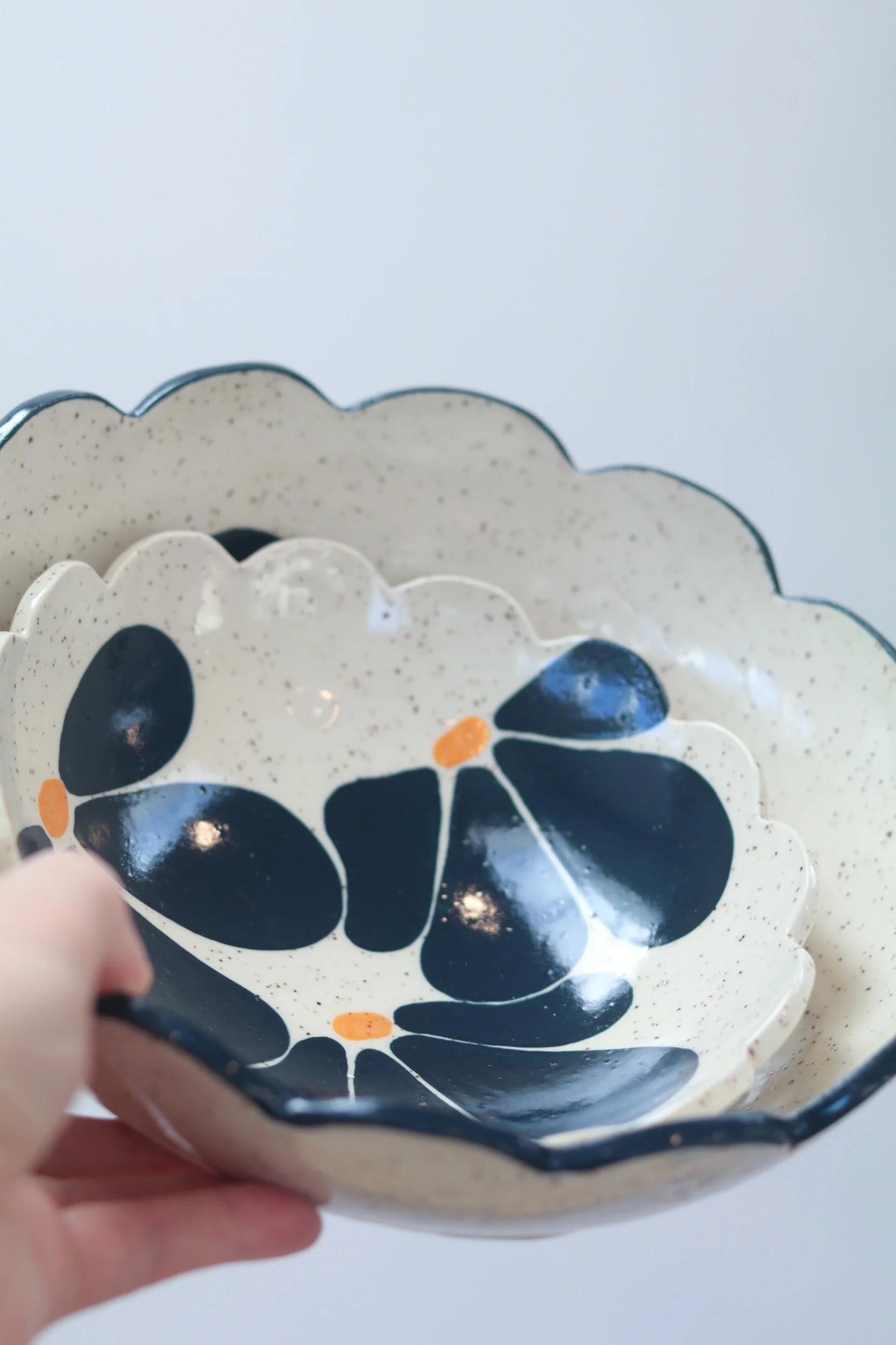 This hand-painted serving set was handmade using clay slabs. The set comes with two bowls that nest inside of each other, making it a beautiful set for hosting or an everyday statement piece for design. The Floral Picnic Collection was inspired by a modern take on vintage botanical dish-ware sets, and features bold colors!