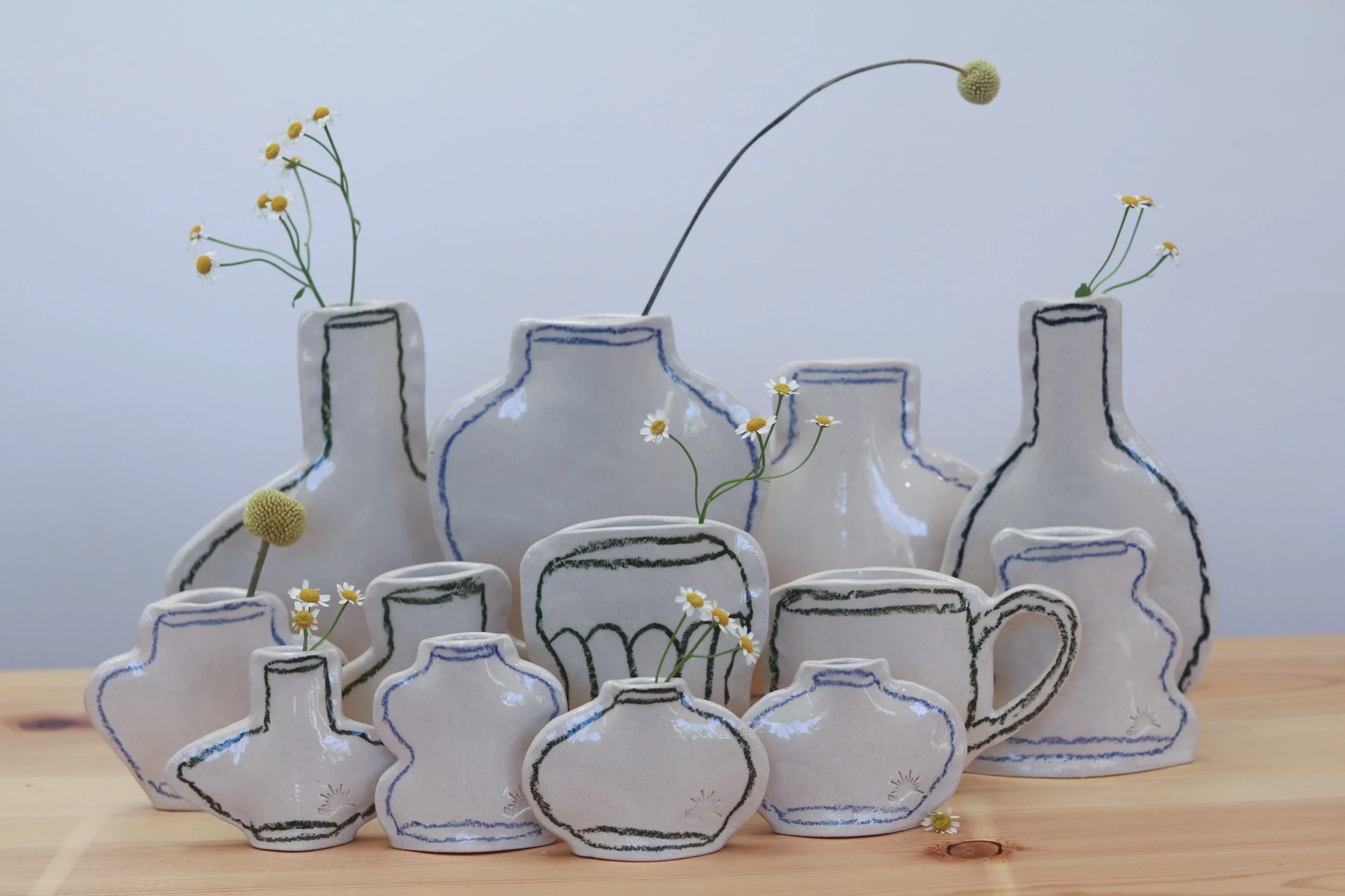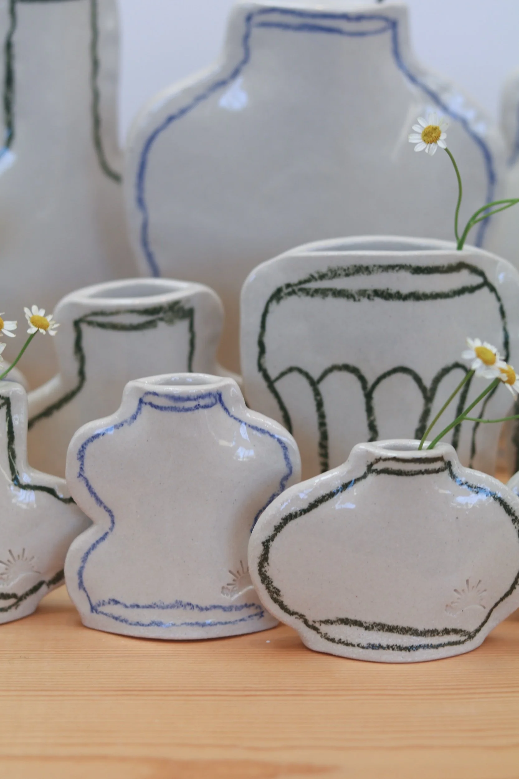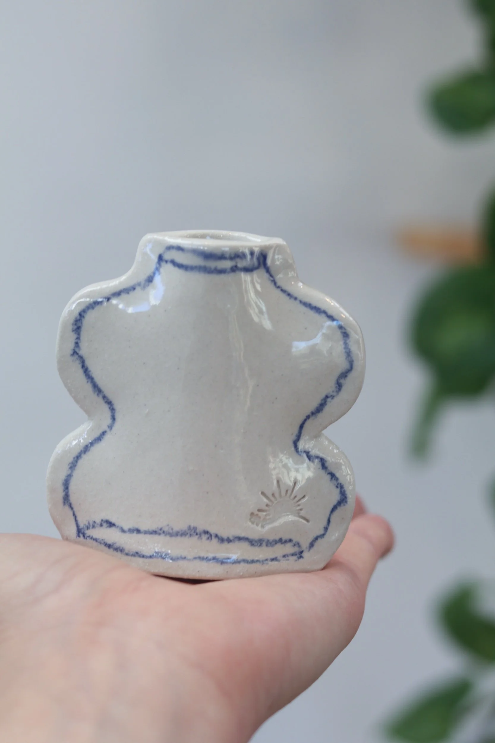 The pocket vase collection was made for everything from a little collection of fresh florals to plant propagations. Fully glazed, these pieces can hold water as long as your favorite glass! The thin profile makes them the perfect addition to a windowsill or a bookcase. Each piece is hand-drawn using an oil pastel made especially for the high firing temperatures of pottery.