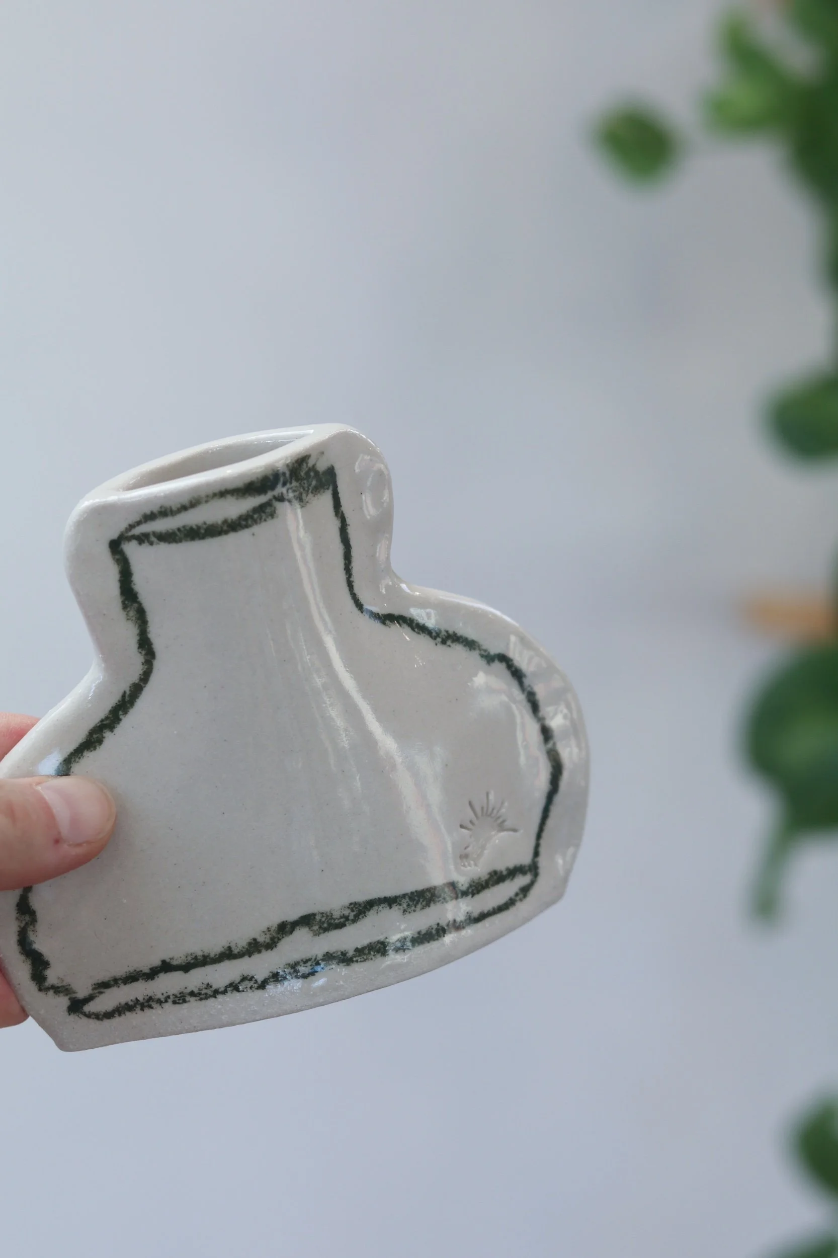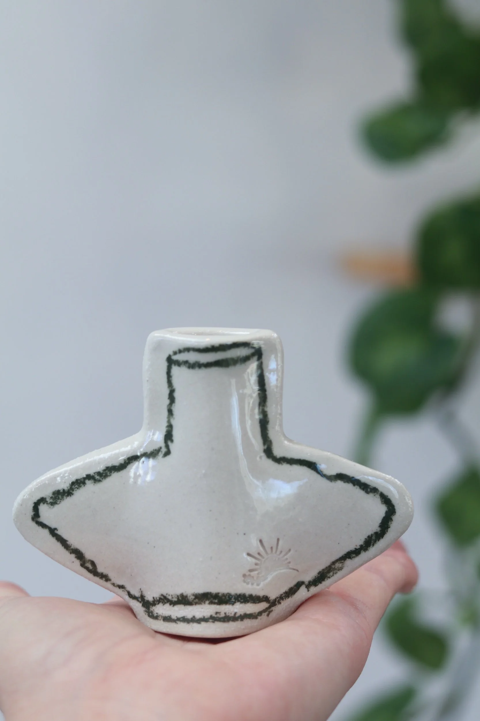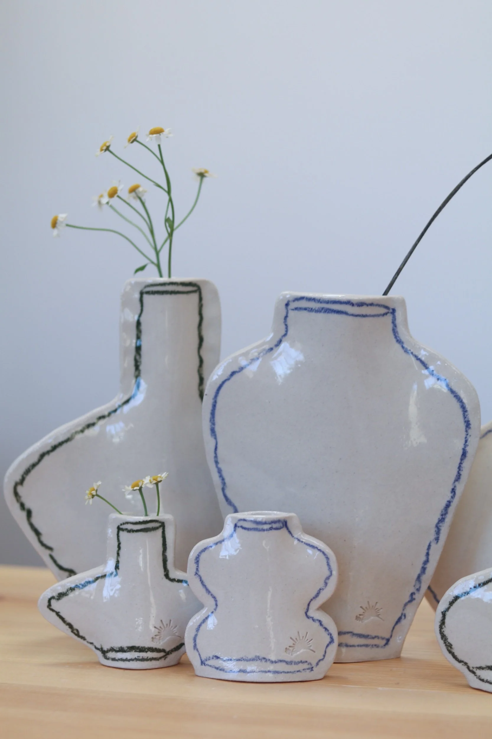 The pocket vase collection was made for everything from a little collection of fresh florals to plant propagations. Fully glazed, these pieces can hold water as long as your favorite glass! The thin profile makes them the perfect addition to a windowsill or a bookcase. Each piece is hand-drawn using an oil pastel made especially for the high firing temperatures of pottery.