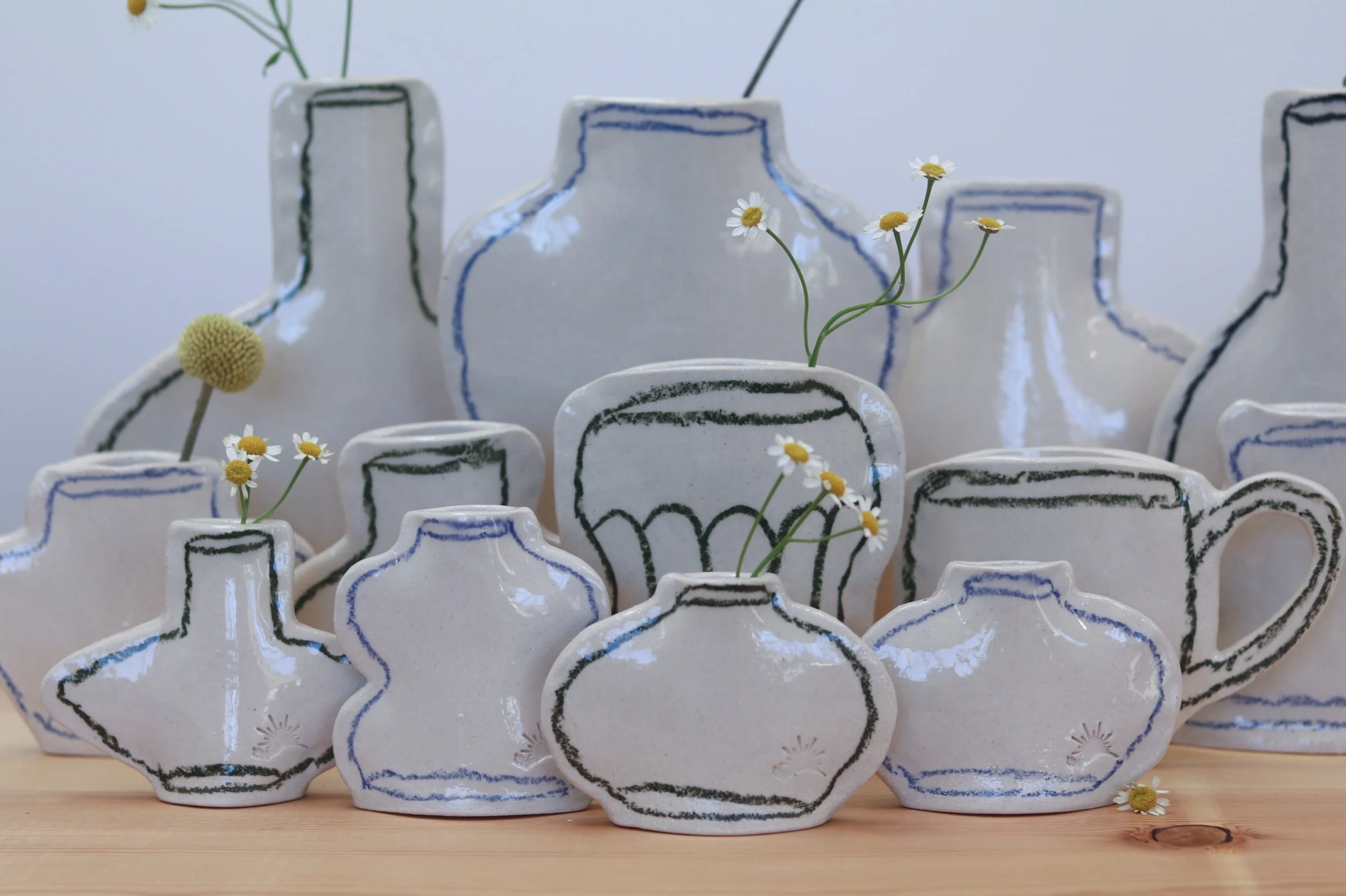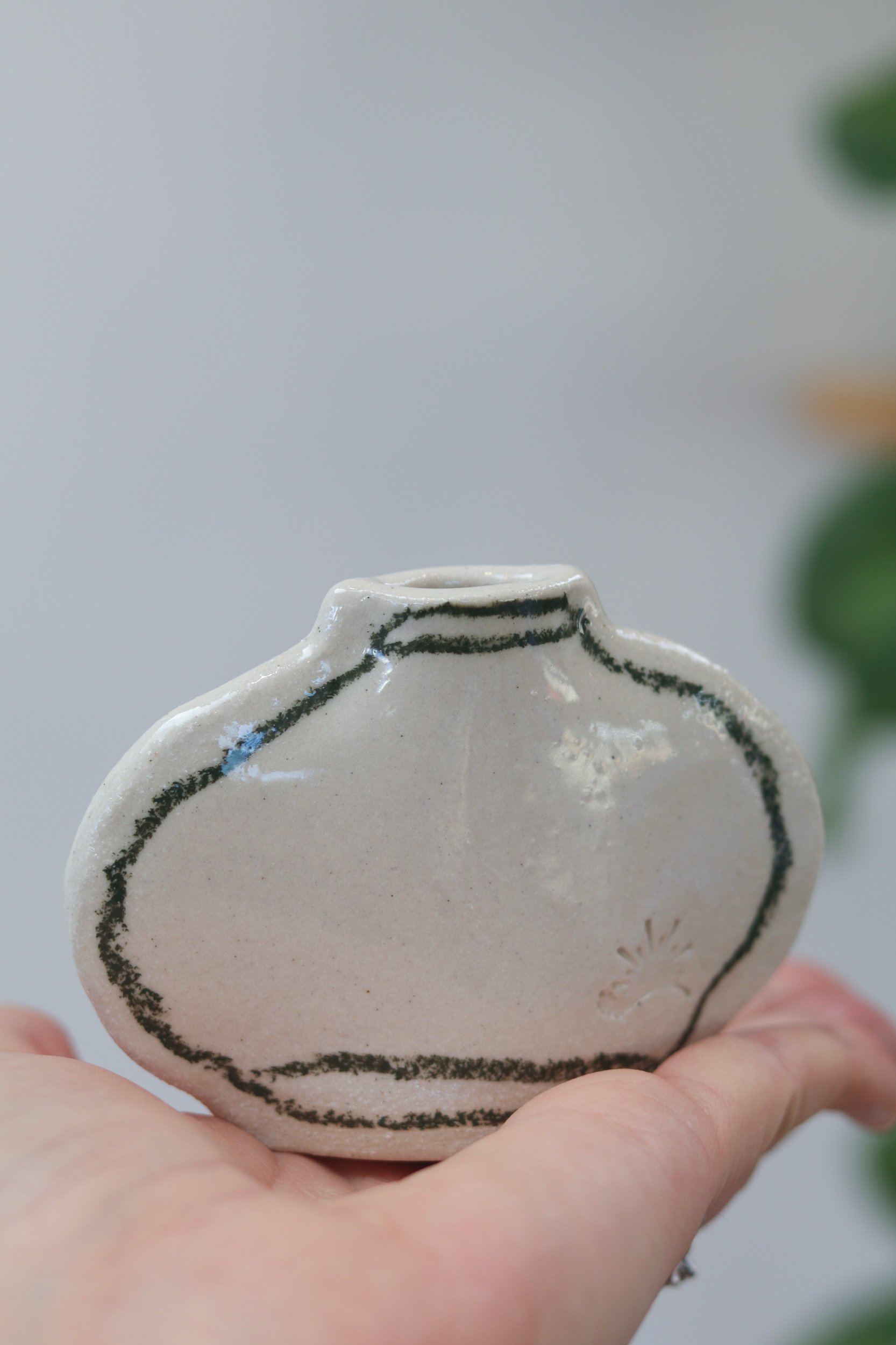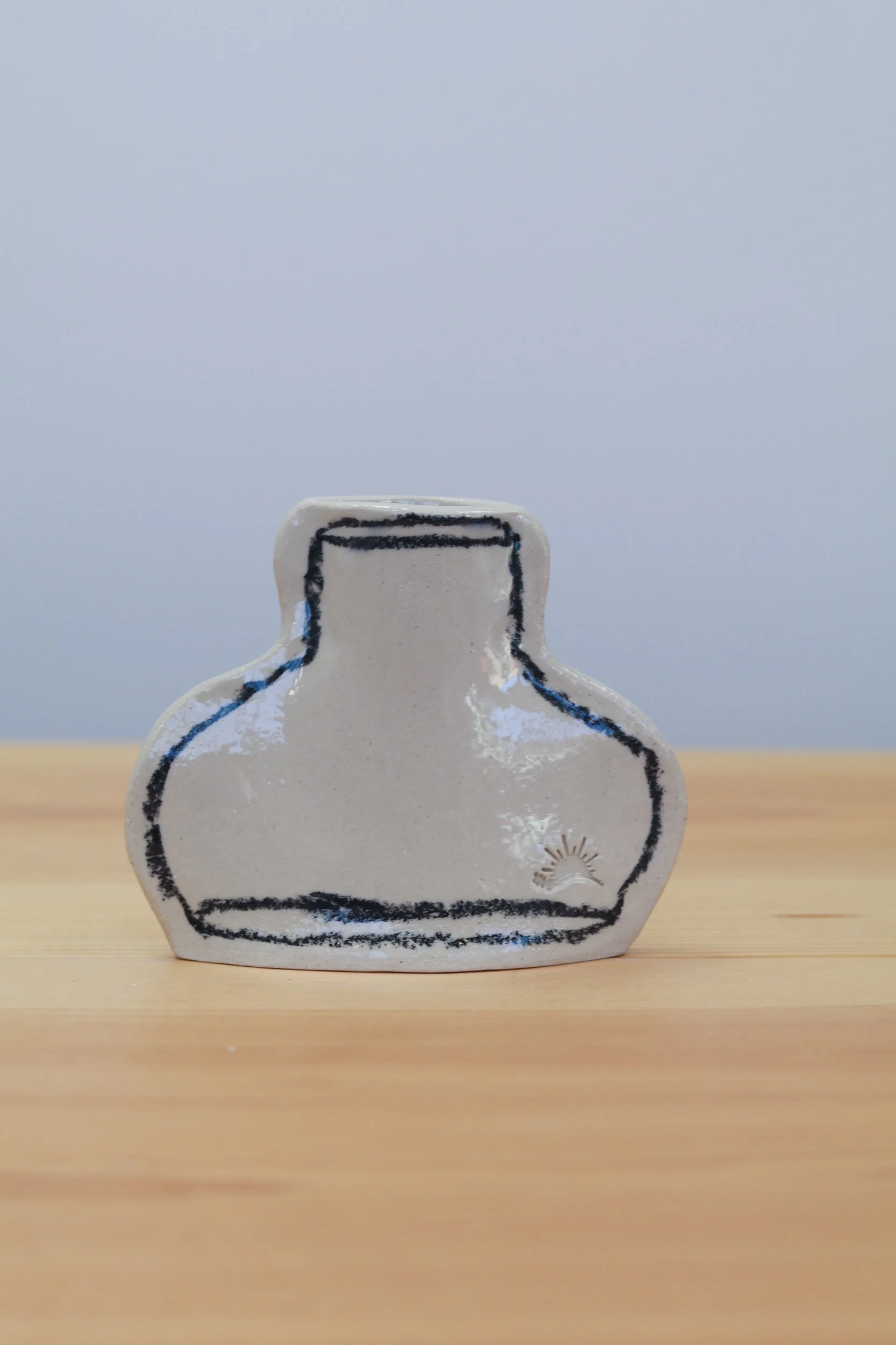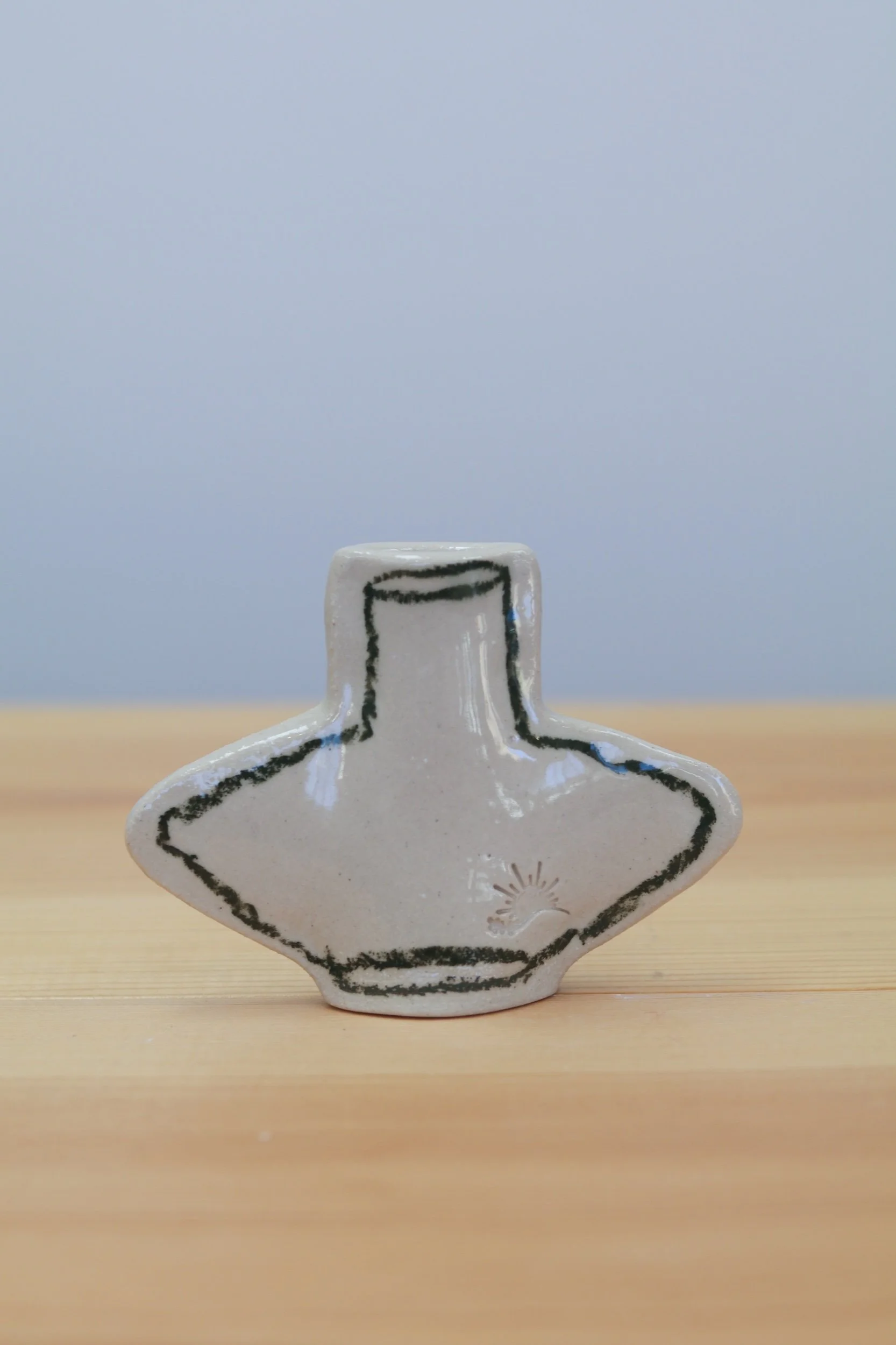 The pocket vase collection was made for everything from a little collection of fresh florals to plant propagations. Fully glazed, these pieces can hold water as long as your favorite glass! The thin profile makes them the perfect addition to a windowsill or a bookcase. Each piece is hand-drawn using an oil pastel made especially for the high firing temperatures of pottery.
