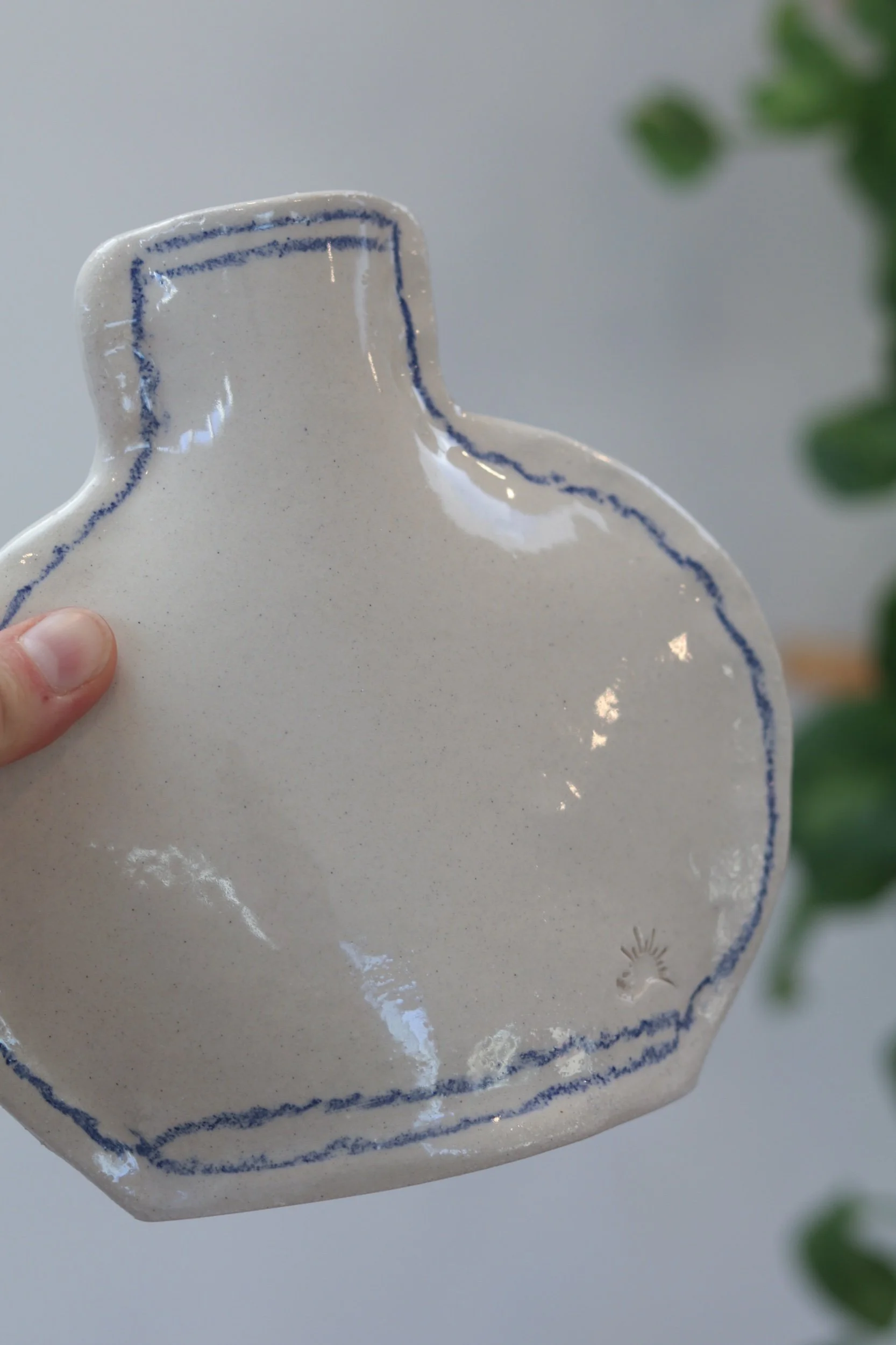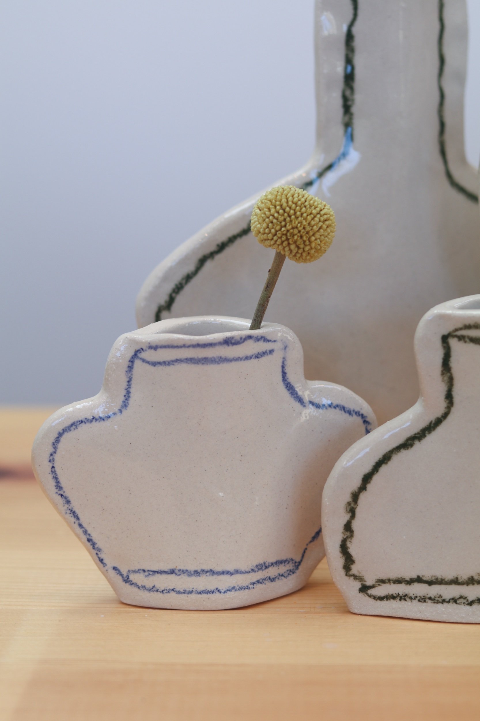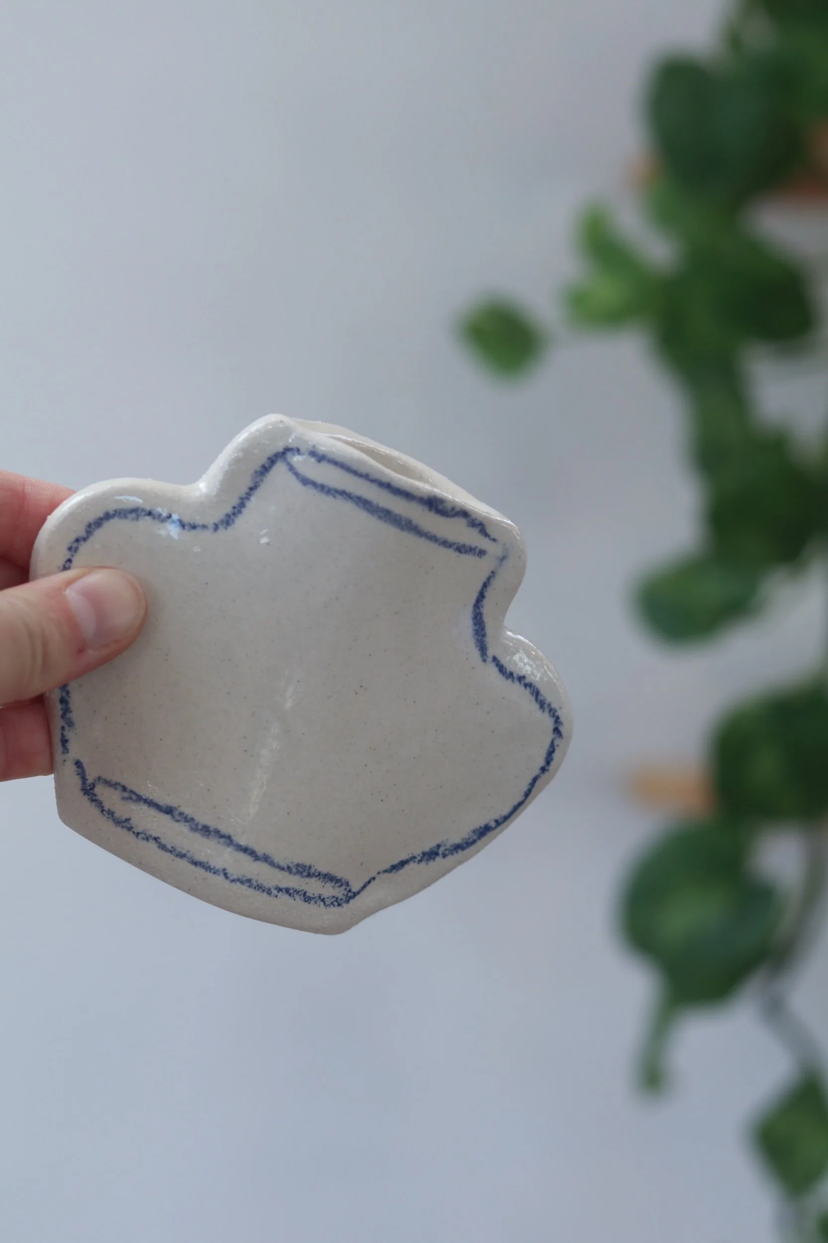 The pocket vase collection was made for everything from a little collection of fresh florals to plant propagations. Fully glazed, these pieces can hold water as long as your favorite glass! The thin profile makes them the perfect addition to a windowsill or a bookcase. Each piece is hand-drawn using an oil pastel made especially for the high firing temperatures of pottery.